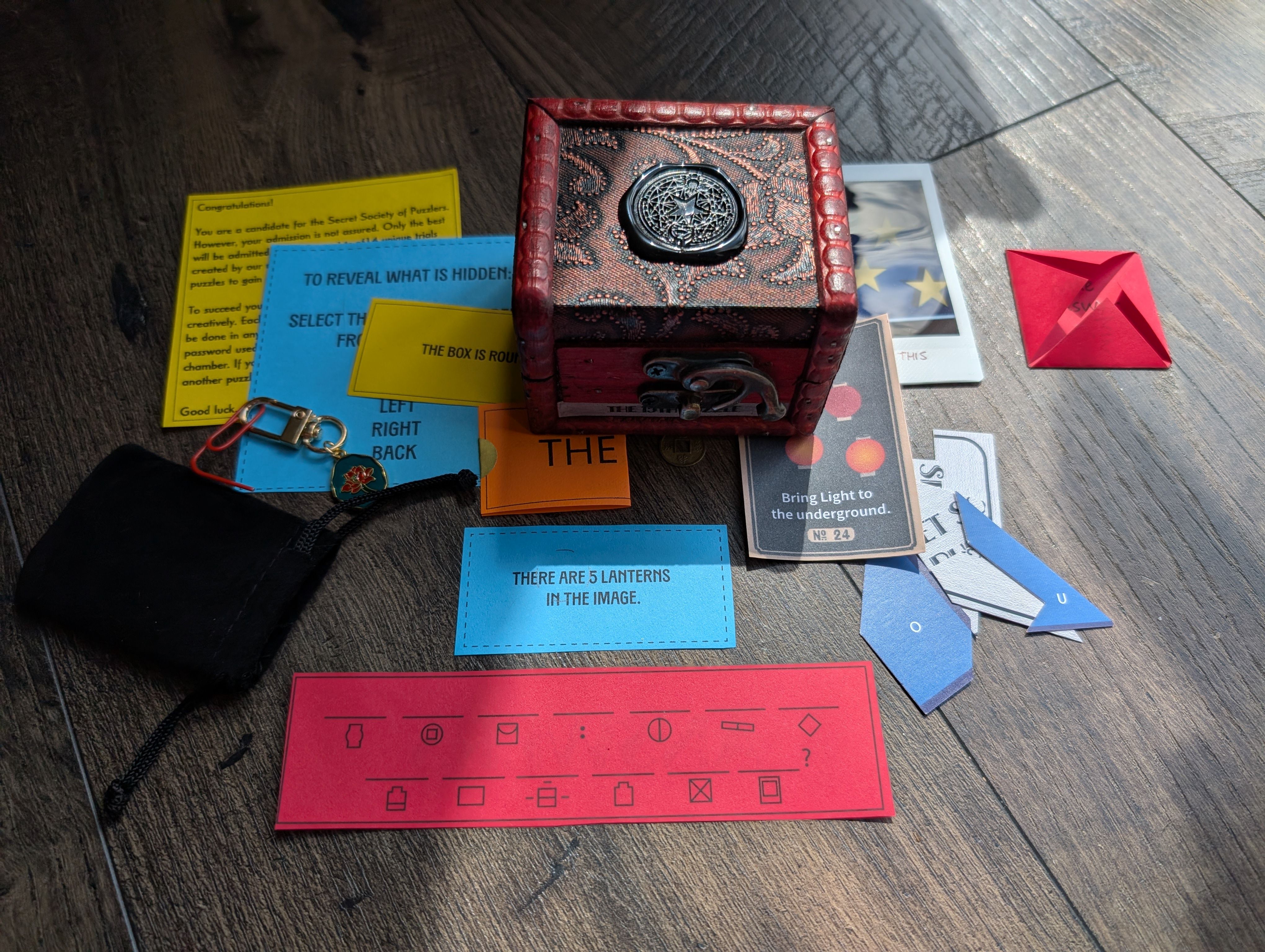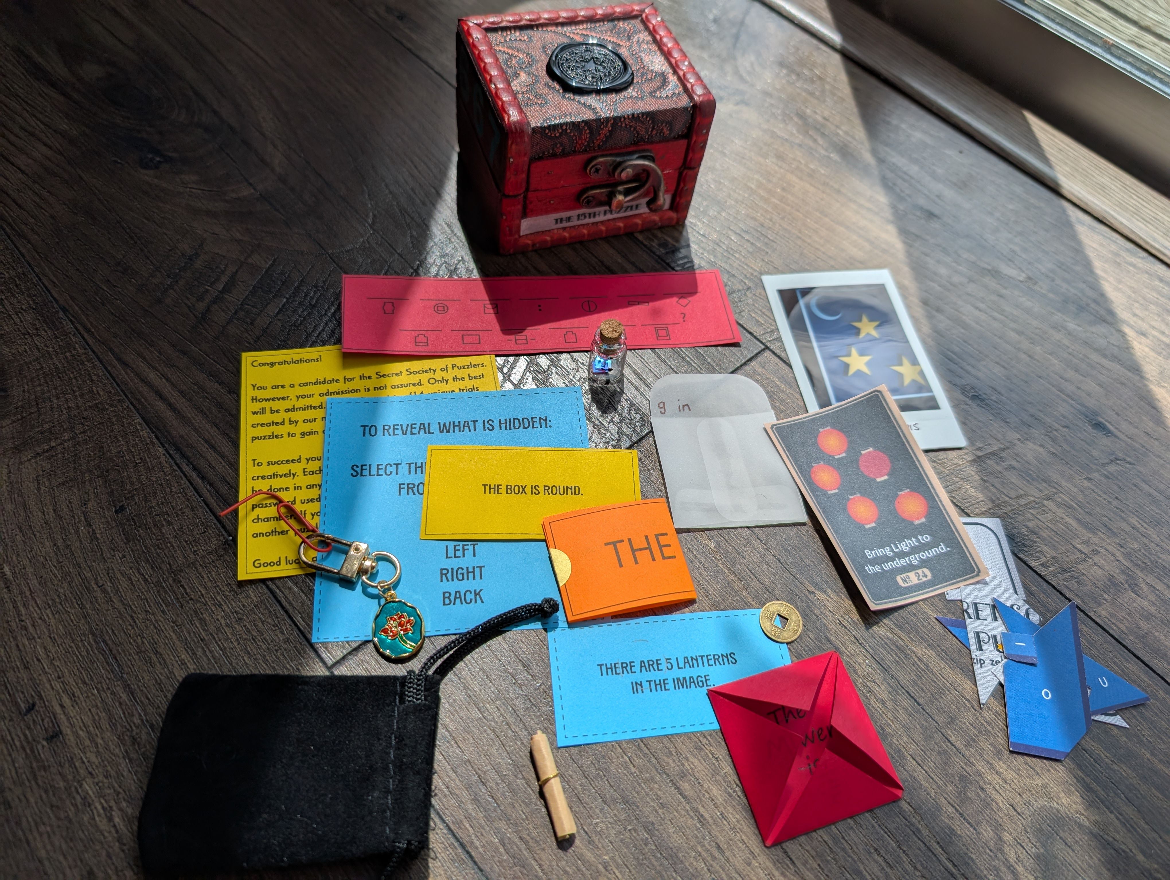 The 15th Puzzle is a handmade "escape-room-in-a-box" style puzzle game that can be played completely screen-free, with everything included right in the box. However, hints and a walkthrough are available online if needed. Puzzles include spatial, math, logic and require creative thinking. Only the worthy will solve them all!